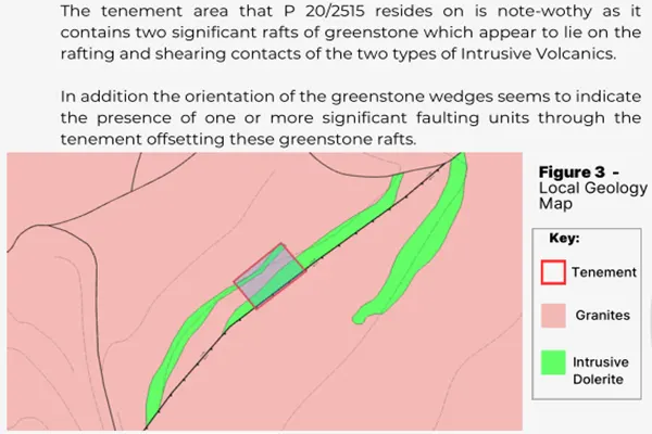 The report recommends focusing on contacts between greenstone units and host rocks, where shear/contact mineralisation is most likely to develop. For its size, the lease is said to contain a large amount of prospective ground for this style.